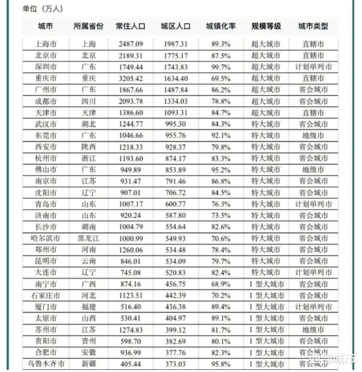要注意的是,这里的人口规模是指城区常住人口,而不是全域常住人口,也不是城镇常住人口。